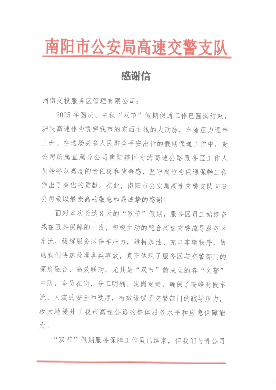 《一天內(nèi)連收兩封感謝信…》 “雙節(jié)”期間,面對(duì)假期車(chē)流人流驟增,公司所屬服務(wù)區(qū)科學(xué)部署、積極應(yīng)對(duì),圓滿(mǎn)完成安全…